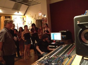 While tracking the new mix, Nate heard an opportunity to record a gang vocal for the song’s final chorus. With the goal of having the track radio-ready in time for the 6/30 Paradise show, the logistics of pulling over 20 talented and busy music people into a studio for one night seemed pretty daunting. Yet within an hour of sending out invitations, the responses came pouring in and people from all walks of the Boston music community were eager and excited to help. And because the song is about radio, having DJs Anngelle Wood and Michael Marotta agree to take part in the chorus made the event all the more meaningful.